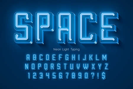 Neon light 3d alphabet, retro-futuristic origainal type.
