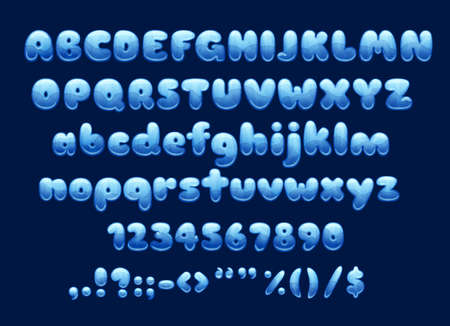 Cartoon water bubbles and drops font. Vector blue bubble letters, numbers and signs. Water bubble and drops type ABC alphabet of cartoon foam splash or aquatic liquid, balloons with wave gradient