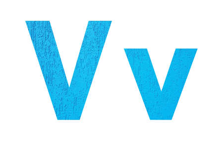 Alphabet uppercase and lowercase letters V with wall texture. Blue letter V in upper and lower case isolated on white background.