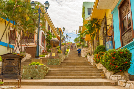 Guayaquil, Ecuador - April 16, 2016: Houses and the stgairs at Cerro Santa Ana, a touristic attraction of Guayaquil, Ecuador.