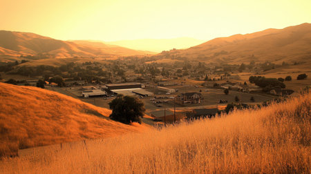 A stunning landscape captures a tranquil town nestled in golden hills at dusk, showcasing mountains and vibrant natural beauty, ideal for relaxation.
