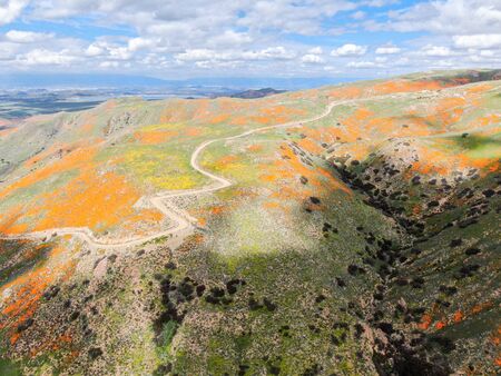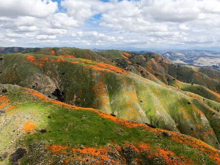 Aerial view of Mountain with California Golden Poppy and Goldfields blooming in Walker Canyon, Lake Elsinore, CA. USA. Bright orange poppy flowers during California desert super bloom spring season.