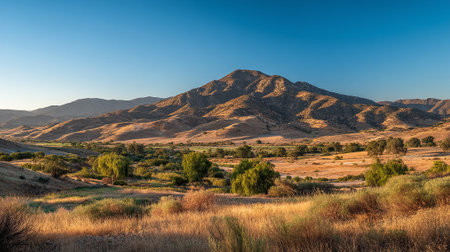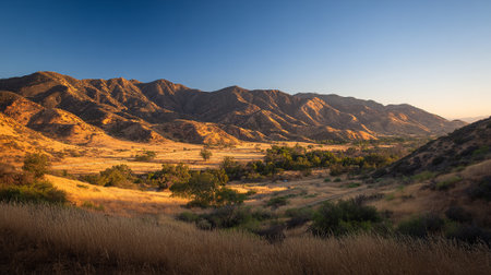 Golden Hour Illuminates a California Landscape with Mountains and Open Fields