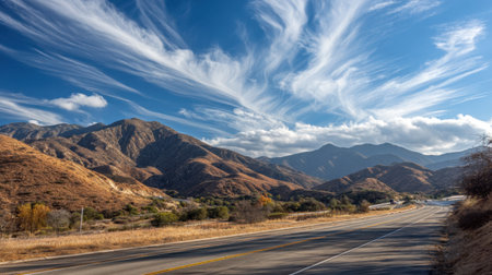 A breathtaking view of rolling mountains and a vibrant sky filled with clouds, showcasing a peaceful highway that invites exploration and adventure.