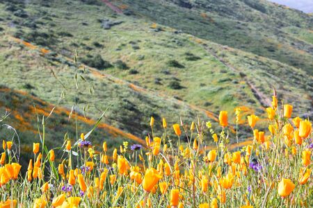 Poppies and green hills at Walker Canyon, in Lake Elsinore, California