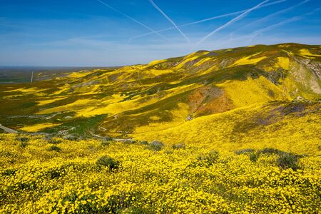 Bright yellow wildflowers and rolling hills at Carrizo Plain National Monument during the superbloom