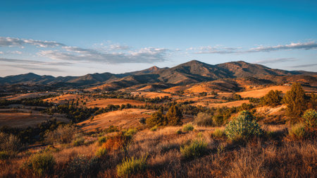 Golden Hour Light Illuminating Rolling Hills Landscape with Grassy Valley