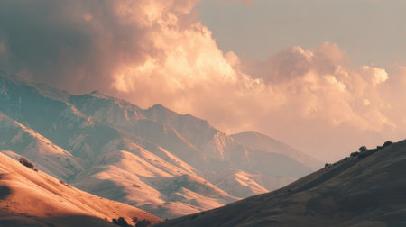 A breathtaking mountain landscape captured at dusk, showcasing rolling hills bathed in warm hues under a clear sky with soft clouds. Ideal for nature lovers.