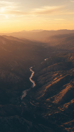 Golden sunlight casts a warm glow on rolling hills, illuminating a twisting river below. The tranquil scene reveals the beauty of untouched nature at dusk, inviting reflection.