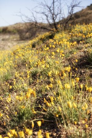A beautiful shot of yellow flower hills with clear blue sky in the background