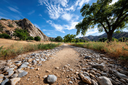 A rocky path winds through a dry creek bed towards distant hills under a bright blue sky