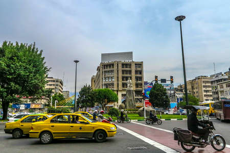 Tehran Ferdowsi Square Statue with Heavy Traffic Taxi Cars and Motorbikes