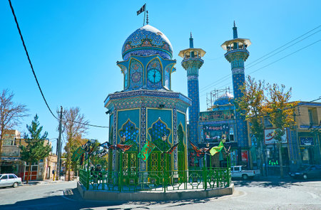 RAYEN, IRAN - OCTOTBER 16, 2017: The circular traffic in Inqilab (Revolution) square with Shia Shrine to Martyr of Iran-Iraq War in the middle and Jame mosque on the background, on October 16 in Rayen.