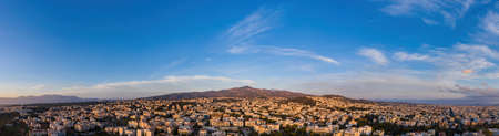 Athens, Greece aerial drone panoramic view from Penteli mount at sunset. Sundown over Greek capital.