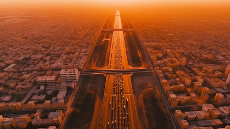 Generative AI : Aerial view of a straight long road in the middle of Sharjah desert in UAE