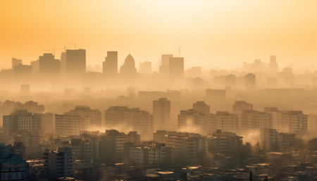 A stunning cityscape bathed in soft pastel colors during sunset. The skyline features modern buildings against a backdrop of mountains, creating a tranquil atmosphere.