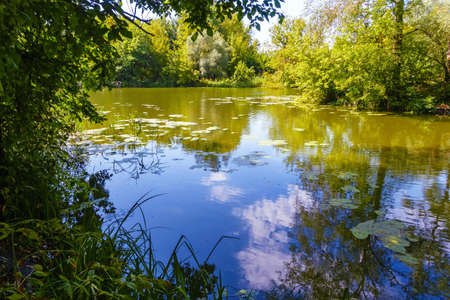 Beautiful spring pound scene, close up fresh water with copy space, splash screen for pc. outdoor horizontal nature background. AI generative image.