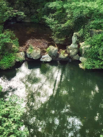Tranquil Japanese garden with koi pond surrounded by lush greenery and serene landscape
