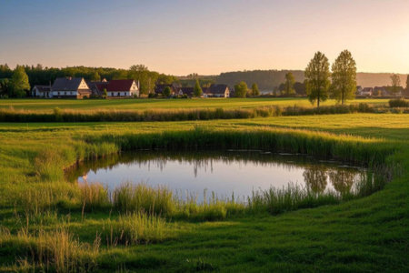 A serene landscape featuring a calm pond with circular ripples spreading across the water's surface. The setting sun casts a warm glow on the surrounding trees, whose reflections are mirrored in the water, creating a peaceful and idyllic atmosphere.