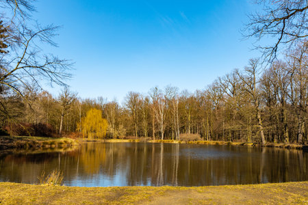 A serene park scene featuring a calm pond, surrounded by lush trees under a clear blue sky, providing a perfect getaway for relaxation and nature appreciation.