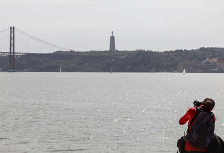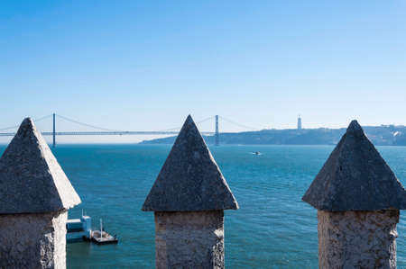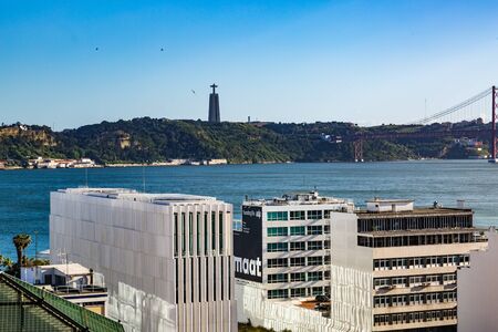 Lisbon symbol in the city centre. Cais das Colunas, 24 da Avril bridge, Jesus statue. Lisbon or Lisboa, Portugal