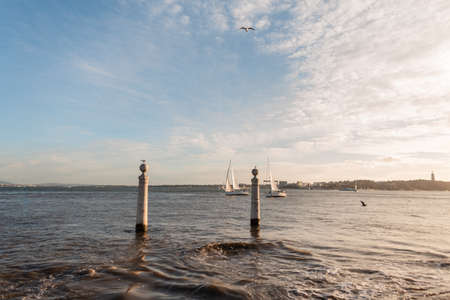 Beautiful sea with two sails and birds at a golden sunset in Lisbon, Portugal. Promenade