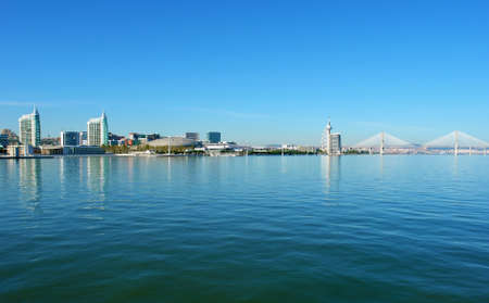 View from river Tagus of Lisbon's Nations park and Vasco da Gama Bridge, Portugal