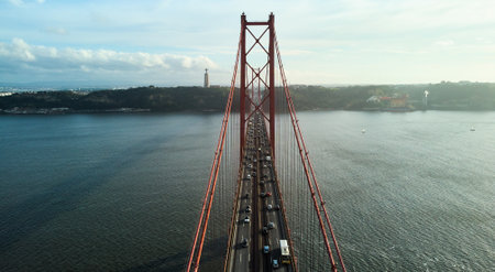 Aerial view of 25th April Bridge in Lisbon, Portugal. Famous landmark on river Tagus.