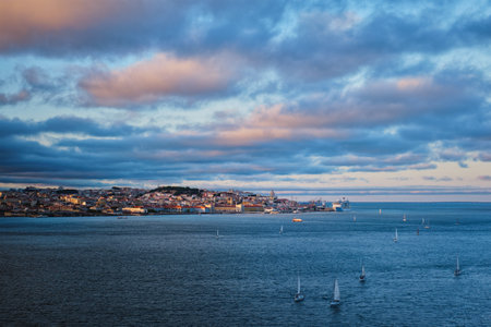 View of Lisbon over Tagus river from Almada with yachts tourist boats at sunset with dramatic sky. Lisbon, Portugal