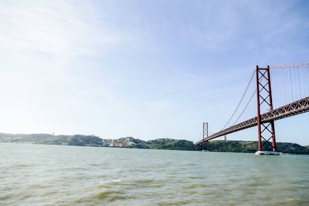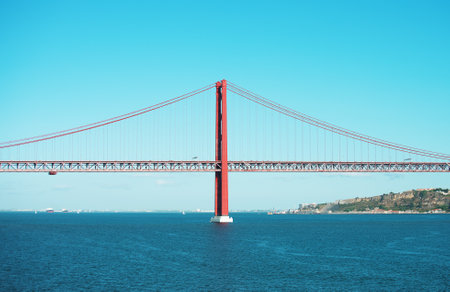 Beautiful panoramic view of 25th of April Suspension Bridge, 25 de Abril Bridge, over the Tagus river in Lisbon, Portugal