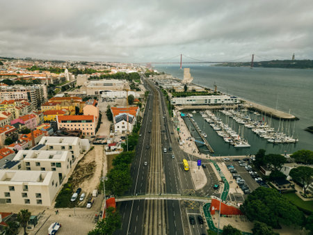 Lisbon, Portugal, June 2 2024 - aerial view of Avenida Brasilia and Avenida da India, parallel to the railway. High quality 4k footage