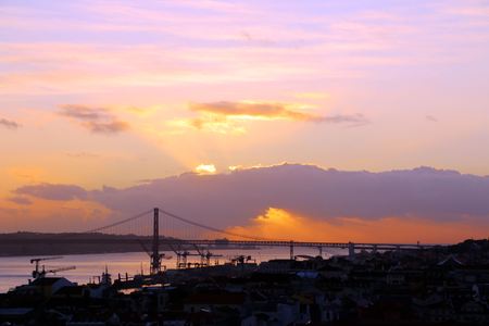 Lisbon city center and 25 de Abril Bridge at sunset. Portugal.