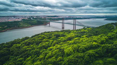 High-altitude drone shot of Vasco da Gama Bridge weaving over the Tagus River, surrounded by lush greenery and urban areas