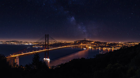 Iconic Vasco da Gama Bridge glowing in Lisbon's nightscape, its lights reflecting on the river under a clear starry sky
