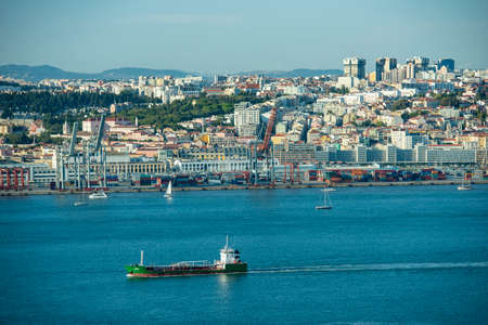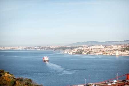 Landscape view on the Tagus river with ship and bridge during the morning light in Lisbon city, Portugal