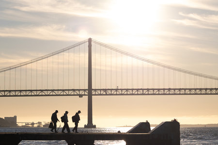 silhouette of people on rowing boat on the sea with suspension bridge in the background at sunset. Lisbon, Portugal.