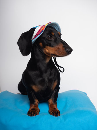 Black and tan dachshund dog seated with summer hat for sun