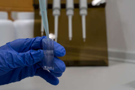 Tube of Taq polymerase for DNA amplification and automatic pipette in hands wearing gloves