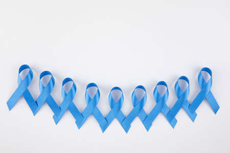 Doctor, hands hold a blue ribbon as a symbol of hope, faith. help, medical concept.