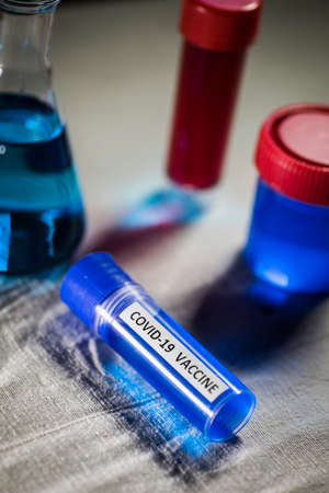 Conceptual image of a recipient containing a vaccine for coronavirus COVID-19, in a lab.