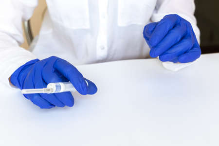 Doctor in white gown at hospital in blue medical gloves with syringe, preparing concept photo
