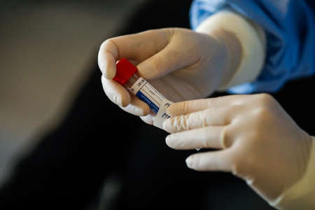 Bucharest, Romania - March 13, 2020: Details with the hands of a medic using a coronavirus test on a person.