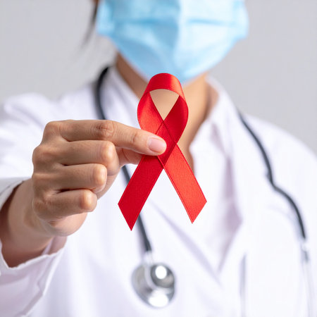 healthcare and medicine concept - close up of female doctor or nurse holding red aids awareness ribbon