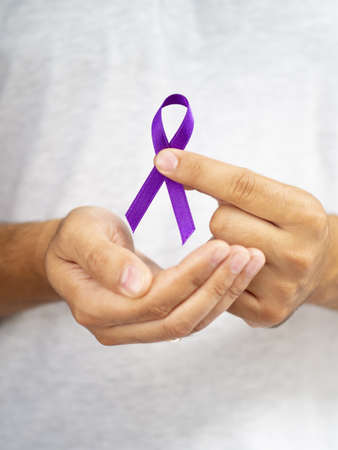 close up man holding up purple ribbon. High quality beautiful photo concept