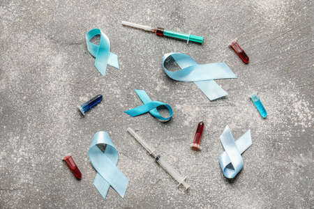 Blue ribbons, medication and blood sample on gray background. Prostate cancer awareness concept