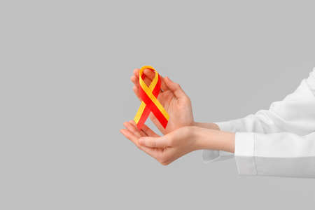 Female doctor with awareness ribbon on gray background. Hepatitis concept