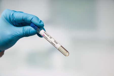 hand in medical gloves holding a test tube for corona virus antibody analysis with result markers in front of a lab room