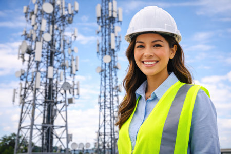 Female Engineer Wearing Safety Helmet Near Telecommunications Towers