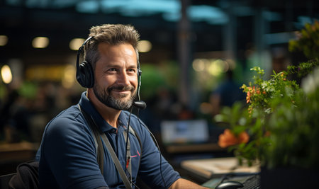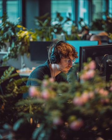 Focused Work with Headphones and Plants