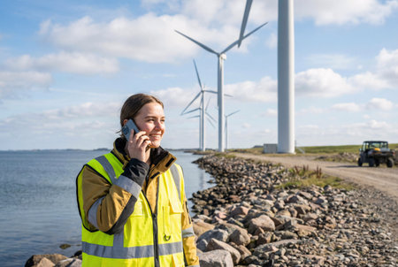 Female engineer talking on mobile phone in front of wind turbines on a wind farm